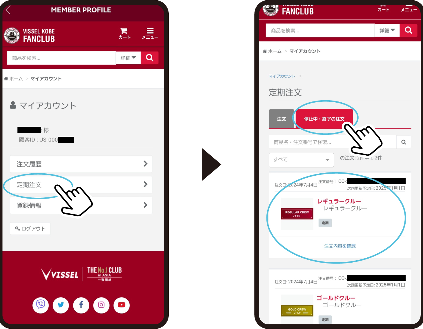 - 2026年1月1日(木・祝)以降、「百年構想リーグ+2026/27シーズン」にご入会のコースが「注文」タブに表示されている事、および、「停止中・終了の注文」タブに2025シーズンにご入会されていたコースが表示されている事をご確認ください。