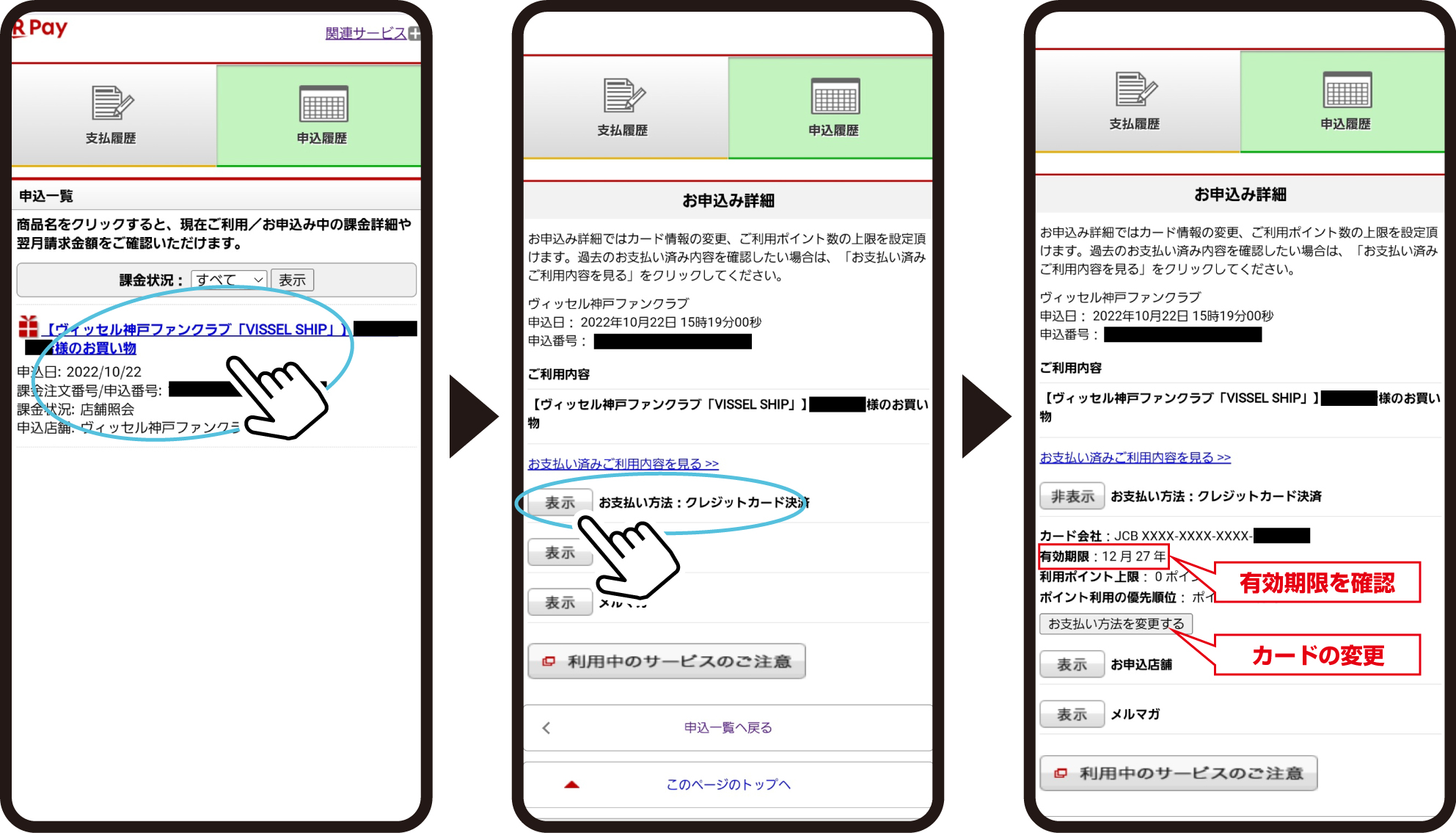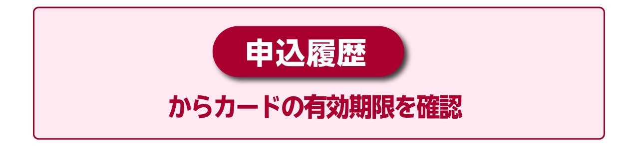 - 「申込履歴」を開き、申込一覧から「現在ご入会頂いているコースの購入履歴」→「クレジットカード決済」横の「表示」ボタンをタップし有効期限を確認。