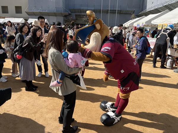 当日はモーヴィも登場し、子どもたちから大人まで、たくさんの笑顔に出会うことができました。ガラポン抽選会は大人気で、なんと終了30分前に完売!1等の選手サイン入りユニフォームTシャツを目指して、多くの方にチャレンジしていただきました。