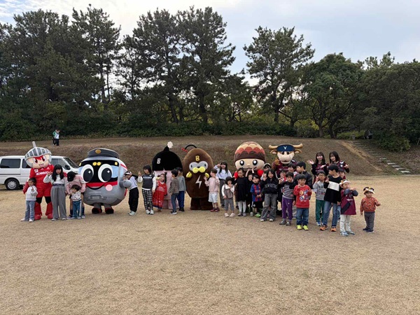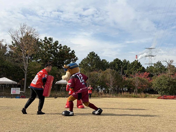 イベントの終盤には、マスコットたちによるタックル対決も行われ、モーヴィが牛のようなタックルを見せ、見事優勝。会場からは大きな歓声と拍手が沸き起こりました。秋晴れの心地よい天気の中、スポーツを通じて多くの方々と交流でき、笑顔あふれる一日となりました。(古山)