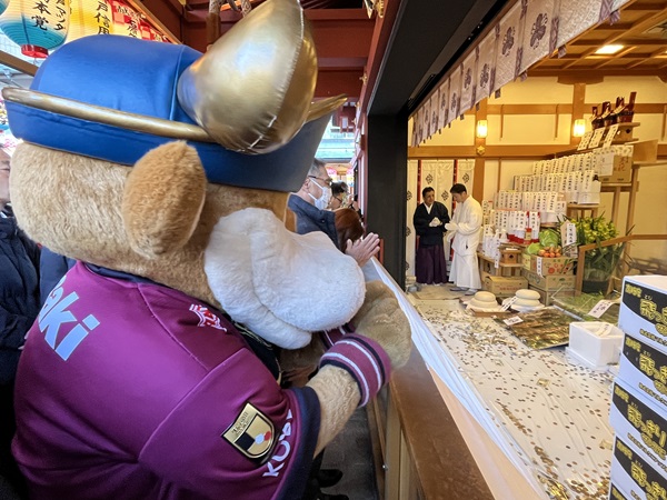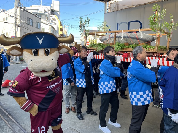 今年も神戸中央卸売市場・神戸水産物卸協同組合の皆様とともに、まぐろ奉納神事に参加しました。大きなまぐろを載せた神輿を担ぎ、蛭子神社周辺の町内を練り歩きます。モーヴィとヴィッセルセレイアも「わっしょい」という元気な掛け声で盛り上げました。本殿へ奉納された大マグロや鯛、ブリなどの海の幸は圧巻の迫力です。