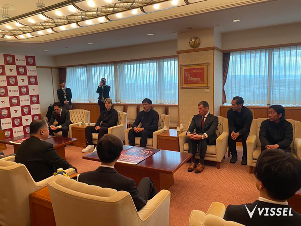 2026/01/28 神戸市長へ表敬訪問 日時 2026年1月28日(水)13:45~14:00 場所 神戸市役所 主催者 神戸市 参加者 千布勇気社長、スキッベ監督、山川哲史選手、大迫勇也選手、井手口陽介選手 百年構想リーグの開幕前に、久元喜造神戸市長を表敬訪問しました。 新体制となったスキッベ監督が「神戸の街が気に入っている。百年構想リーグでも全力で戦います」と抱負を述べました。選手たちも感謝の言葉とともに「サッカーを通じて神戸を盛り上げたい」とそれぞれ意気込みを語りました。 久元市長からは「これからも神戸市民を元気づけてほしい。皆さんの活躍を楽しみにしています」と激励の言葉をいただきました。選手たちは市長の言葉に感謝を述べ、地域の期待に応えるべく決意を新たにしました。 ヴィッセル神戸は、これからも神戸市民に愛されるクラブであり続けます。