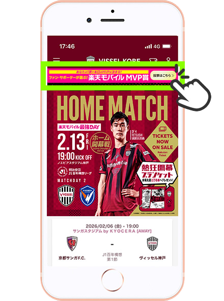 - 試合開始から終了までの間に、ヴィッセル神戸公式スマホアプリの“ホーム”画面にあるバナーをタップ