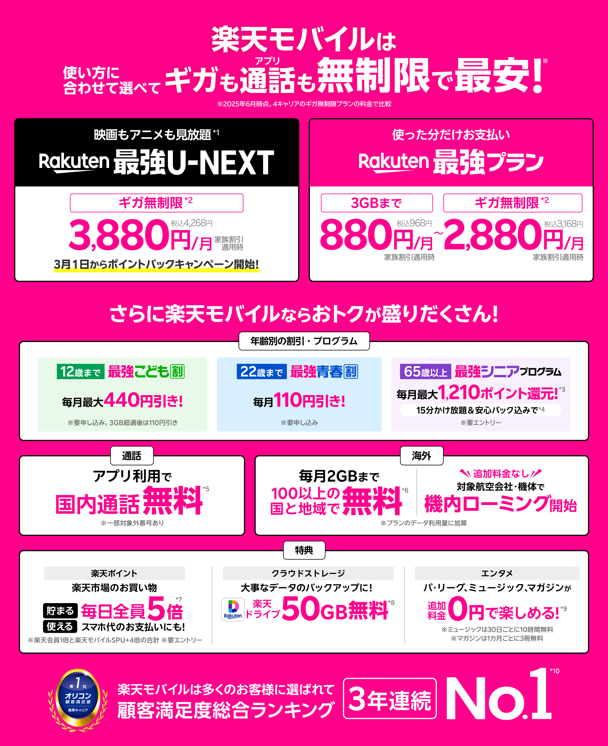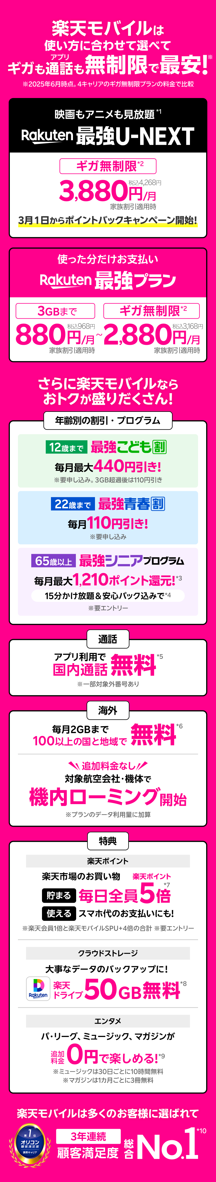 ※製品代、オプション料は別費用 *1 別途有料作品等あり *2 混雑時など公平なサービス提供のため速度制御する場合あり *3 期間限定ポイント。全ての条件を満たしたことが確認された月の翌々月末日ごろに付与 *4 一部対象外番号あり。国内通話のみ。各種サービスには使用条件等あり *5 一部対象外番号あり。Rakuten Linkアプリ未使用時30秒22円 *6 通話料等別。2GB超過後は最大128kbps。対象エリア及び条件は変更する場合あり *7 毎月の獲得上限ポイントは2,000ポイント。期間限定ポイント。SPUの詳細はこちら *8 サービスのご利用には別途通信料が発生。高い信頼性と安全性を提供するよう設計されていますが、全てのデータの完全な保護を半永久的に保証するものではありません。*9 ミュージックとマガジンの対象コンテンツに一部制限あり。各キャンペーンは予告なく変更・終了する場合あり。その他一部条件あり。エンタメコンテンツの詳細はこちら