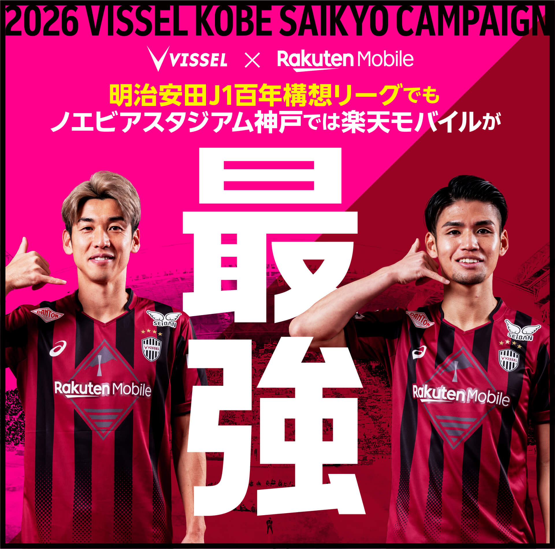 | 以下【1】【2】の条件を満たした楽天会員の方が対象です。 【1】チケットを保有している試合の月末時点で、楽天モバイル「Rakuten最強U-NEXT」「Rakuten最強プラン」「Rakuten最強プラン(データタイプ)」のいずれかを利用開始していること ※2026年3月1日が試合日の場合、3月末に楽天モバイルの利用を確認 【2】楽天モバイル「Rakuten最強U-NEXT」「Rakuten最強プラン」「Rakuten最強プラン(データタイプ)」を契約している楽天IDアカウントで、楽天チケット(ヴィッセル神戸公式チケット)を利用して、「シーズンシート2026 for 明治安田J1百年構想リーグ」を個人契約で購入していること ※ポイント進呈の対象はシーズンシートを2026年1月29日(木)までに購入された方となります。2026年2月以降の購入はポイント進呈の対象外となりますので、ご注意ください。 |