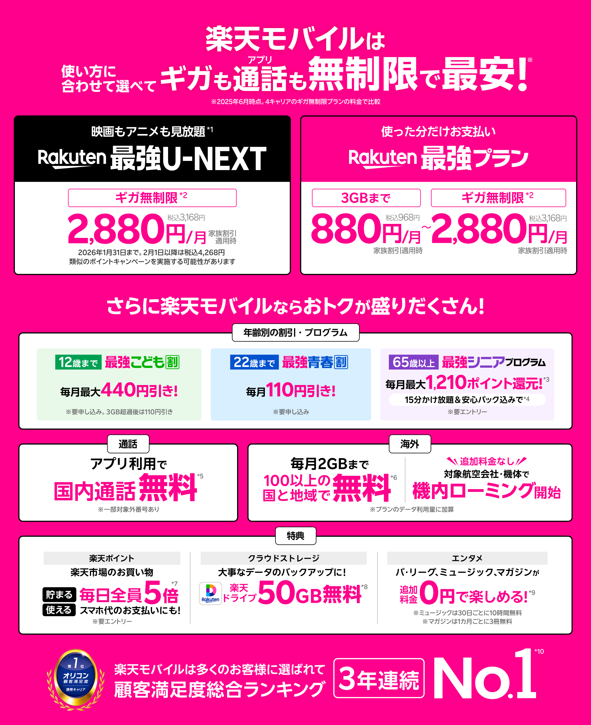※製品代、オプション料は別費用 *1 別途有料作品等あり *2 混雑時など公平なサービス提供のため速度制御する場合あり *3 期間限定ポイント。全ての条件を満たしたことが確認された月の翌々月末日ごろに付与 *4 一部対象外番号あり。国内通話のみ。各種サービスには使用条件等あり *5 一部対象外番号あり。Rakuten Linkアプリ未使用時30秒22円 *6 通話料等別。2GB超過後は最大128kbps。対象エリア及び条件は変更する場合あり *7 毎月の獲得上限ポイントは2,000ポイント。期間限定ポイント。SPUの詳細はこちら *8 サービスのご利用には別途通信料が発生。高い信頼性と安全性を提供するよう設計されていますが、全てのデータの完全な保護を半永久的に保証するものではありません。*9 ミュージックとマガジンの対象コンテンツに一部制限あり。各キャンペーンは予告なく変更・終了する場合あり。その他一部条件あり。エンタメコンテンツの詳細はこちら