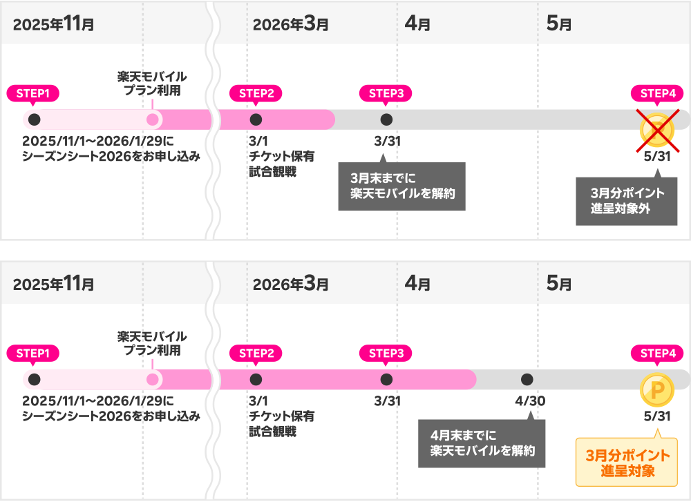 | 「シーズンシート2026」 20%楽天ポイント進呈までの流れ ※楽天モバイル解約の注意事項 |