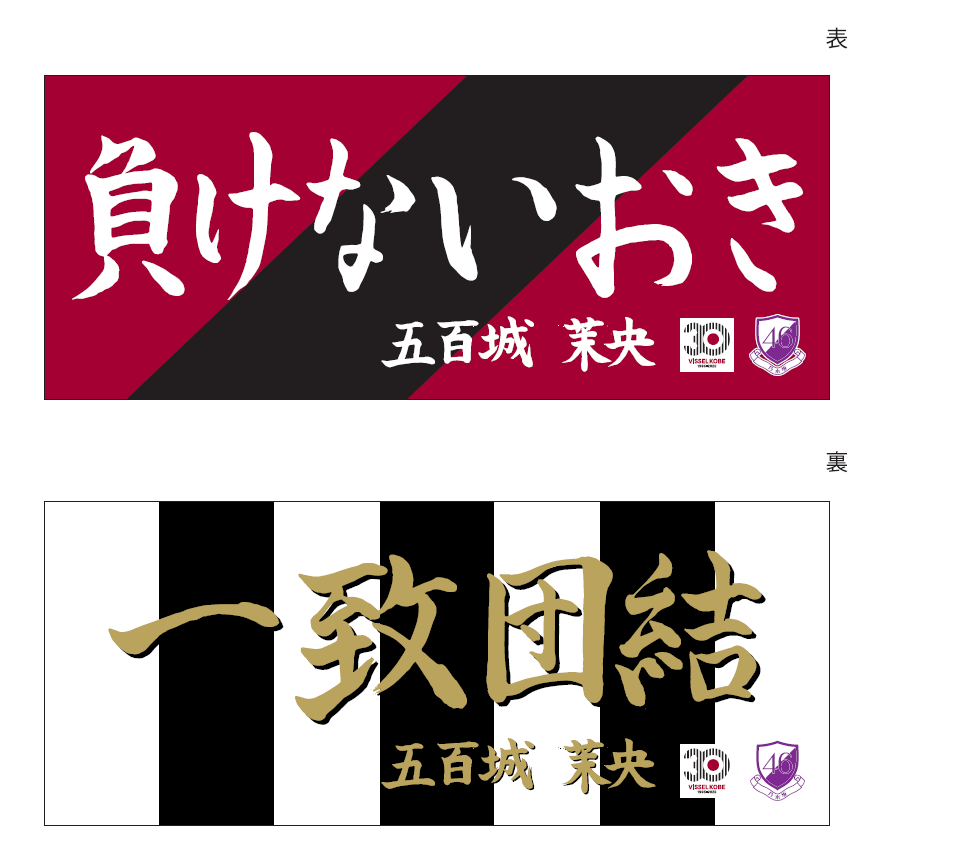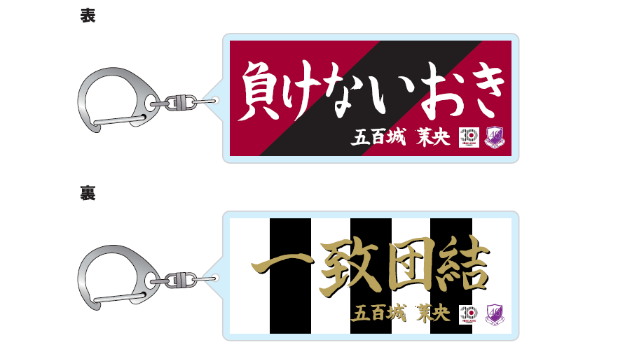 30周年記念ユニフォーム柄のデザイングッズに加え、今回は特技の書道で「負けないおき」、「一致団結」、「五百城茉央」を綴っていただき、グッズにデザインしました。