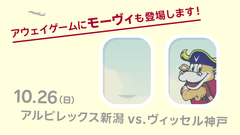 10月26日(日)2025明治安田J1リーグ第35節 アルビレックス新潟vs.ヴィッセル神戸 (14:00キックオフ/デンカビッグスワンスタジアム)にて神戸市と新潟市が観光PRブースを出店し、クラブマスコットの「モーヴィ」がPRのお手伝いにスタジアムに登場しますので、お知らせいたします。