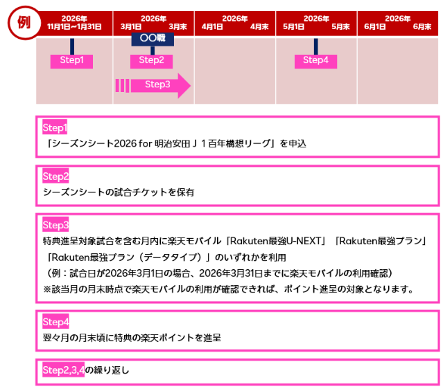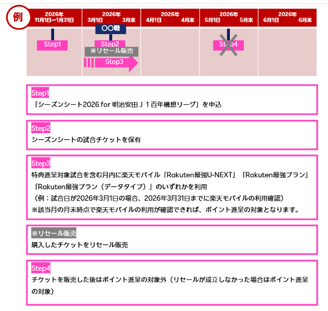 ※2026年3月1日が試合日の場合、3月末に楽天モバイルの利用を確認 - 楽天モバイル「Rakuten最強U-NEXT」「Rakuten最強プラン」「Rakuten最強プラン(データタイプ)」を契約している楽天IDアカウントで、楽天チケット(ヴィッセル神戸公式チケット)を利用して、「シーズンシート2026 for 明治安田J1百年構想リーグ」を個人契約で購入していること