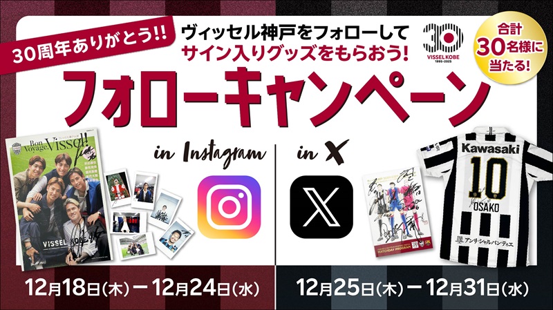 ヴィッセル神戸は、クラブ創設30周年イヤーの締めくくりとして、公式Xと公式Instagramにて「ヴィッセル神戸 30周年ありがとう フォローキャンペーン」を実施いたしますので、お知らせいたします。