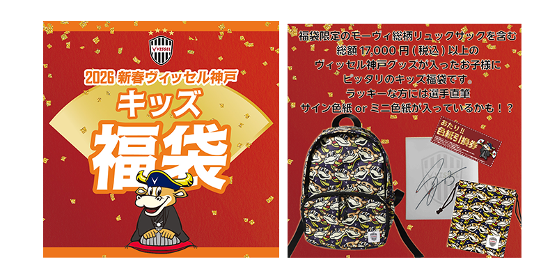 福袋限定のモーヴィ総柄リュックサックを含む総額17,000円(税込)以上のヴィッセル神戸グッズが入ったお子様にピッタリのキッズ福袋です。ラッキーな方には選手直筆サイン色紙orミニ色紙が入っているかも!?