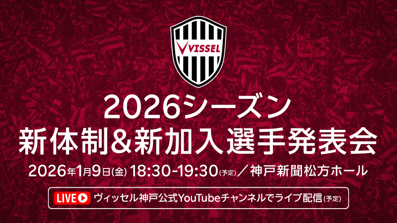 ヴィッセル神戸では、2026年1月9日(金)神戸新聞松方ホール(神戸市中央区)にて、「2026シーズン新体制&新加入選手発表会」を開催することが決まりましたので、お知らせします。