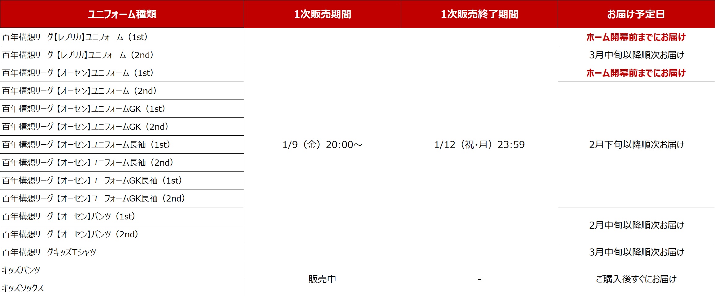 商品によりお届け時期が異なります。詳細は上記商品概要の「1次受注販売(Jリーグオンラインストア限定)」の一覧表よりご確認ください。