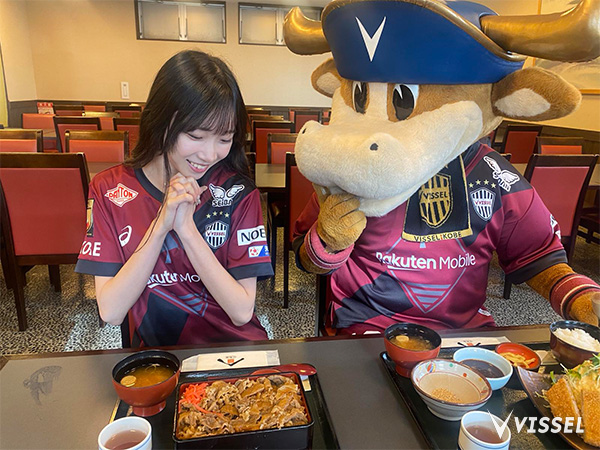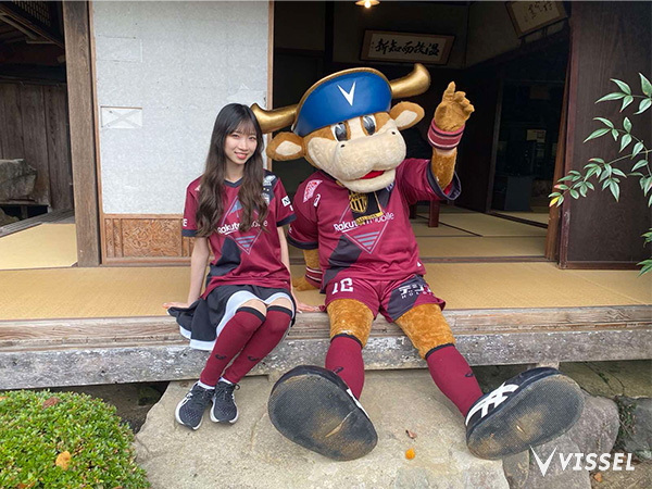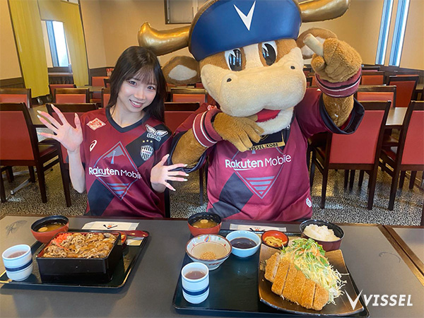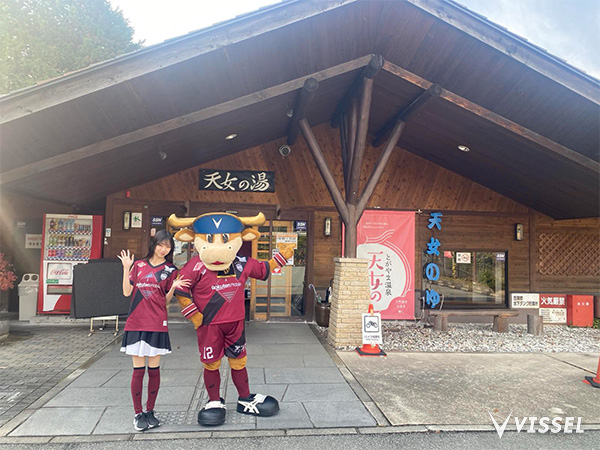 そして、お昼時にはお食事処へ。八鹿豚と但馬牛を使った贅沢なメニューを堪能し、養父市の豊かな食材のおいしさに舌鼓を打ちました。旅の疲れを癒す足湯もあり、モーヴィもヴィッセルセレイアも、養父市の温かいおもてなしに心ゆくまで浸っていました。