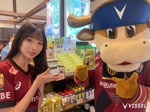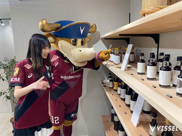 こちらは、養父市の老舗醤油メーカー「大徳醤油」が手掛けるお店で、醤油を中心に様々な発酵食品を取り扱っています。店内に入ると、香ばしい醤油の香りが漂い、モーヴィもヴィッセルセレイアも興味津々。なんとここでは、珍しい「醤油を使ったケーキ」をいただくこともできます。養父市の地域ブランド「やぶの太鼓判」に認定されているお醤油もあり、その品質の高さが伺えます。