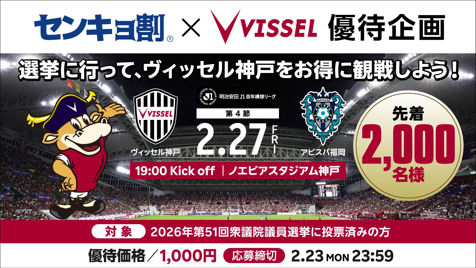 2月27日(金)にノエビアスタジアム神戸で開催されるJ1百年構想リーグ地域リーグラウンド第4節 ヴィッセル神戸vs.アビスパ福岡において、「センキョ割優待企画」を実施することが決まりましたので、お知らせいたします。