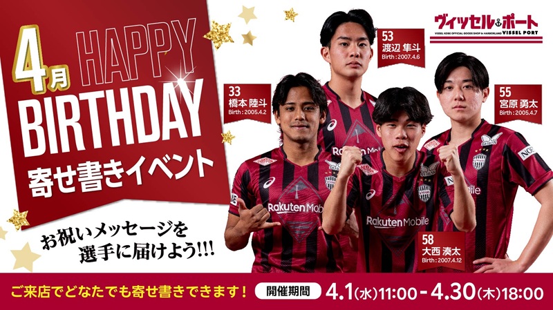 4月より、毎月その月に誕生日を迎える選手に向けて、サポーターの皆さまからの「お祝いメッセージ」を募集するイベントを開催いたします!