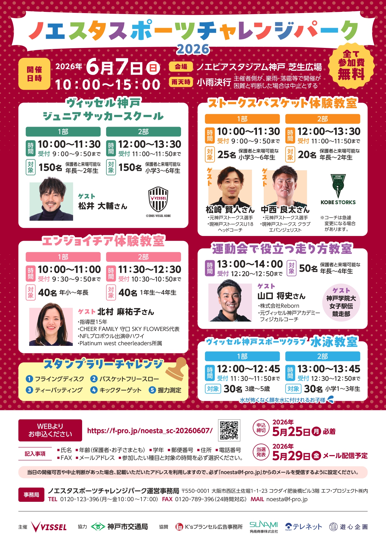 6月7日(日)にノエビアスタジアム神戸にて「ノエスタスポーツチャレンジパーク2026」を開催いたしますので、お知らせいたします。