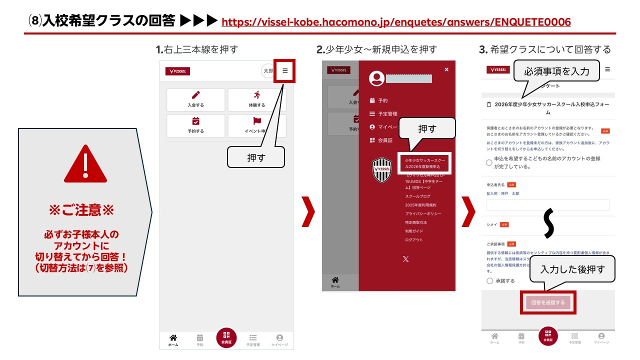 ❽入校希望クラスの回答 ※必ずお子様のアカウントに切り替えてから回答ください。